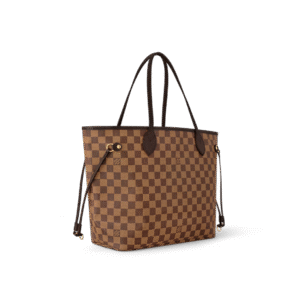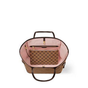 This Neverfull Medium Tote Bag features Damier Ebene canvas accented with cowhide leather trims, and a vibrant fabric lining within its spacious structure. Whether cinched or loosened, the side straps reveal distinct styles. The slender handles allow for easy shoulder carrying or elbow crooking, while the detachable zipped pouch can be used as a clutch or a pocket.