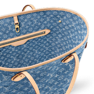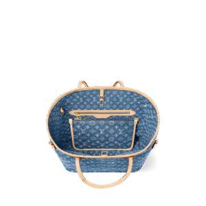 This Neverfull Medium Tote Bag features Monogram denim with cowhide leather trims. The adjustable side straps allow flexible shaping of its silhouette, making it a timeless choice for urban outings. Its spacious interior can easily accommodate a 13-inch laptop, while multiple pockets including a detachable zipped pouch enhance functional practicality.